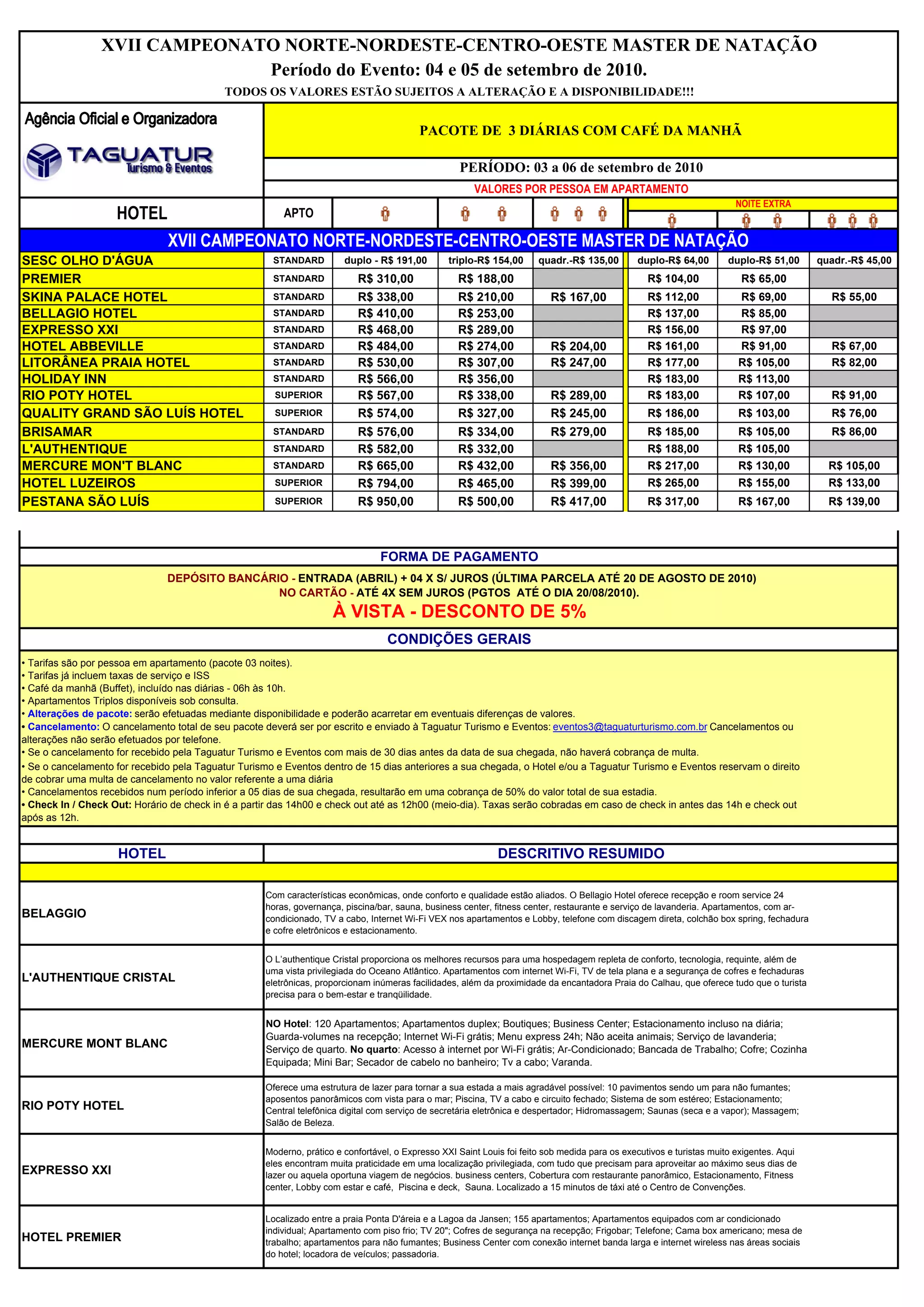 O documento lista pacotes de hospedagem e diárias em hotéis para participantes do XVII Campeonato Norte-Nordeste-Centro-Oeste Master de Natação entre os dias 3 a 6 de setembro de 2010 em São Luís, Maranhão, com valores para apartamentos duplos, triplos e quadruplos e noites extras, além de condições e políticas de reserva, check-in e cancelamento.