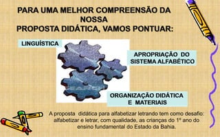 1. O documento discute a proposta didática para alfabetizar crianças do 1o ano do ensino fundamental na Bahia. 2. A proposta é fundamentada nos estudos da linguística, incluindo sociolinguística e psicolinguística. 3. Ela enfatiza atividades estruturantes de análise fonológica e estrutural para que as crianças aprendam o sistema alfabético, complementadas por atividades alimentadoras de leitura e escrita.