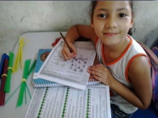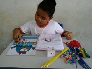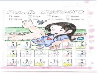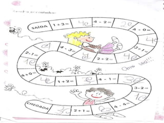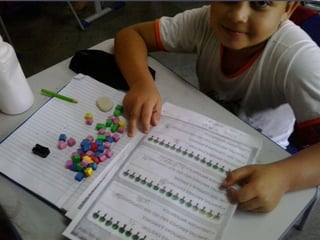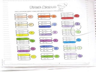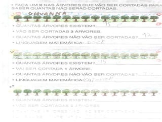 O documento descreve atividades matemáticas realizadas com alunos do 1o ciclo do ensino fundamental. As atividades envolveram classificação, ordenação, contagem, adição e subtração de quantidades usando material concreto como palitos e canudos coloridos. Os alunos trabalharam conceitos como antecessor, sucessor e posição de números em uma sequência numérica.