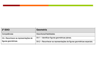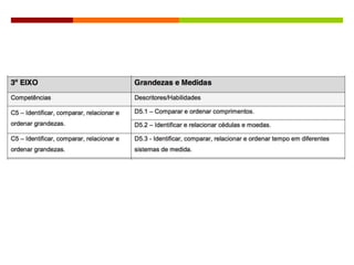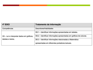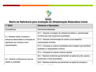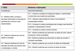 O documento apresenta informações sobre desenvolvimento cognitivo de crianças, incluindo estágios de desenvolvimento, processos cognitivos fundamentais e estratégias e procedimentos usados por crianças em diferentes áreas como números, operações, geometria e tratamento de informação.