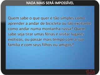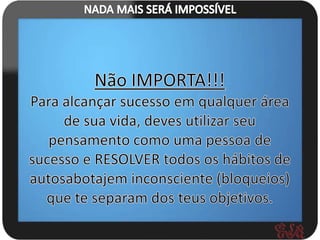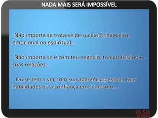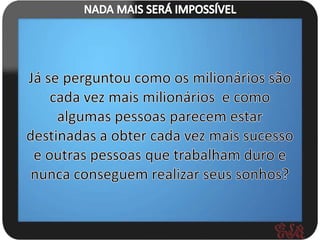O documento apresenta uma coleção de depoimentos entusiasmados de leitores sobre o livro de Stuart Lichtman, que promete ensinar técnicas para alcançar sucesso financeiro e pessoal através da programação mental. Os leitores relatam experiências transformadoras e ganhos financeiros significativos após aplicar os métodos do autor, destacando a eficácia e cientificidade do conteúdo. Lichtman também menciona sua própria trajetória e sucesso em ajudar outras pessoas a realizarem seus objetivos, afirmando que sua técnica pode ser aplicada por qualquer um, independentemente de sua formação ou histórico financeiro.