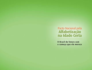 O documento descreve o Pacto Nacional pela Alfabetização na Idade Certa, um compromisso assumido pelos governos federal, estaduais e municipais para garantir que todas as crianças estejam alfabetizadas até os oito anos de idade. O Pacto inclui ações de formação de professores, disponibilização de materiais pedagógicos, avaliações dos estudantes e gestão compartilhada entre os diferentes níveis de governo. O objetivo é que todas as crianças sejam plenamente alfabetizadas até o final do 3o ano