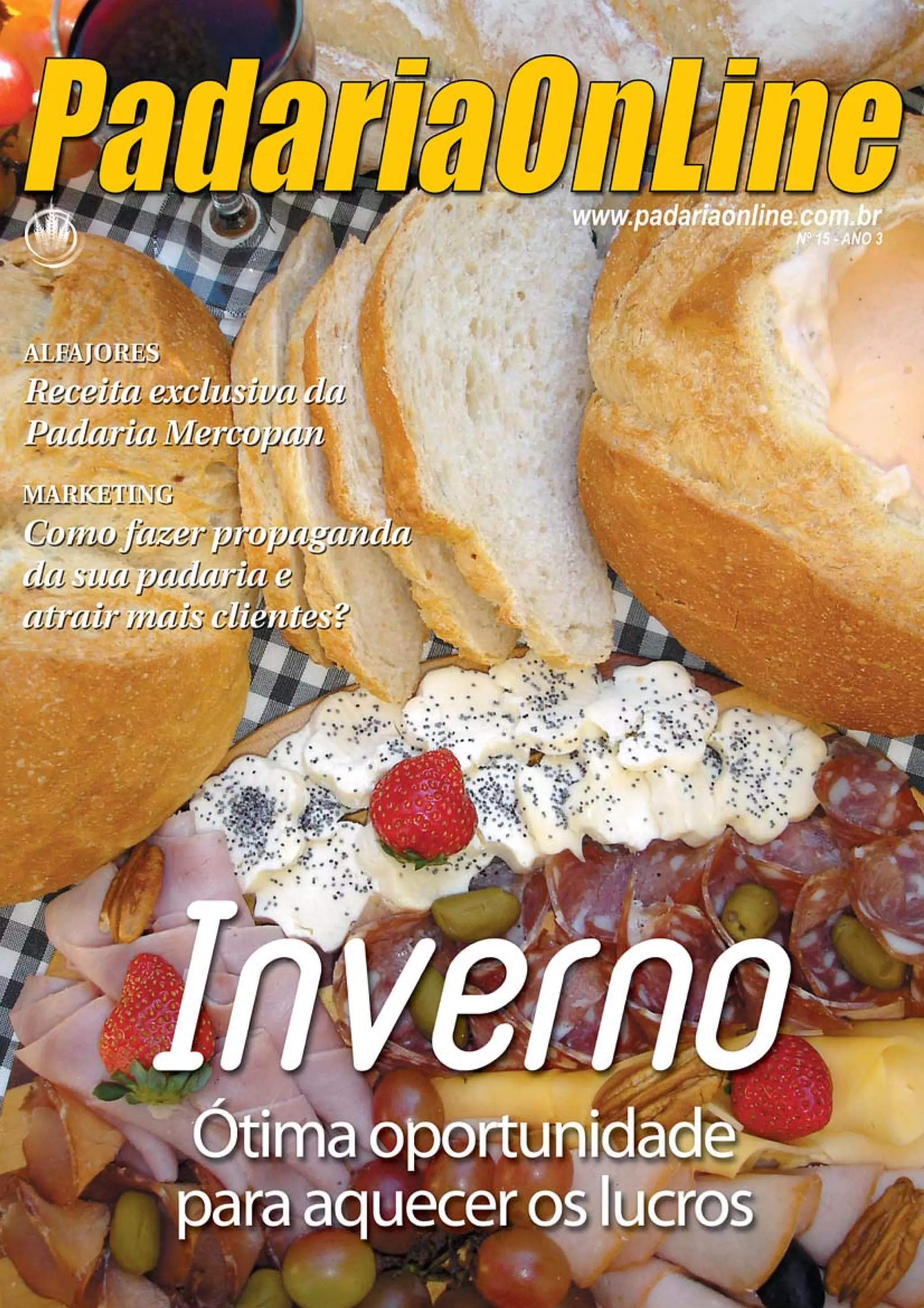 Este documento é uma edição da revista PadariaOnLine. Contém notícias sobre novidades de produtos para padarias, dicas de receitas e gestão, e histórias de sucesso de empresários do ramo.