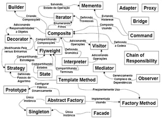 O documento descreve a história e conceitos dos padrões de projeto orientados a objetos. Christopher Alexander cunhou o termo "padrões de projeto" para descrever soluções comuns a problemas recorrentes. Os padrões GoF tornaram-se populares em 1995 e descrevem padrões criacionais, estruturais e comportamentais.