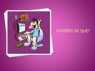 O documento discute padrões de projeto de software, incluindo padrões de criação, estruturais e comportamentais. Também apresenta um padrão de projeto chamado "Page Object" para organizar testes funcionais de páginas web usando orientação a objetos.