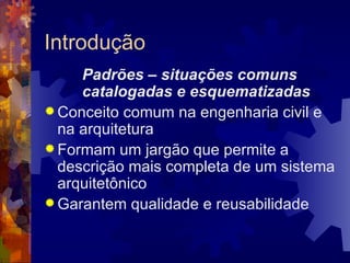 O documento discute padrões de projeto e anti-padrões. Apresenta padrões arquiteturais, de projeto e comportamentais com exemplos. Também descreve anti-padrões de arquitetura, desenvolvimento e gerência, indicando problemas comuns e soluções. O conhecimento de padrões e anti-padrões permite projetar sistemas de melhor qualidade e evitar surpresas.