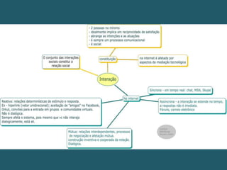 O documento discute padrões e topologias de redes sociais. Apresenta padrões como redes de proteínas e a Internet, e topologias de rede centralizada, descentralizada e distribuída, correspondentes a padrões comunicacionais de um para todos, mediado e entre todos. Também aborda conceitos como capital social, interação, relação e laços sociais.