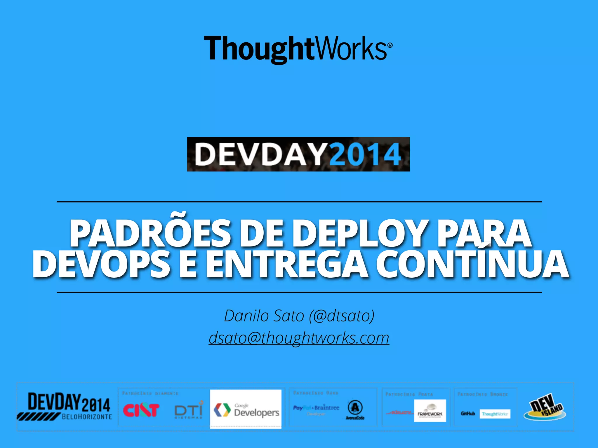 O documento discute padrões para deploy de DevOps e entrega contínua, incluindo pipeline de entrega, implantação azul-verde, implantação canário, feature toggles e dark launching. O objetivo é tornar o deploy um "não-evento" através da automação e entrega incremental de mudanças pequenas e de baixo risco.