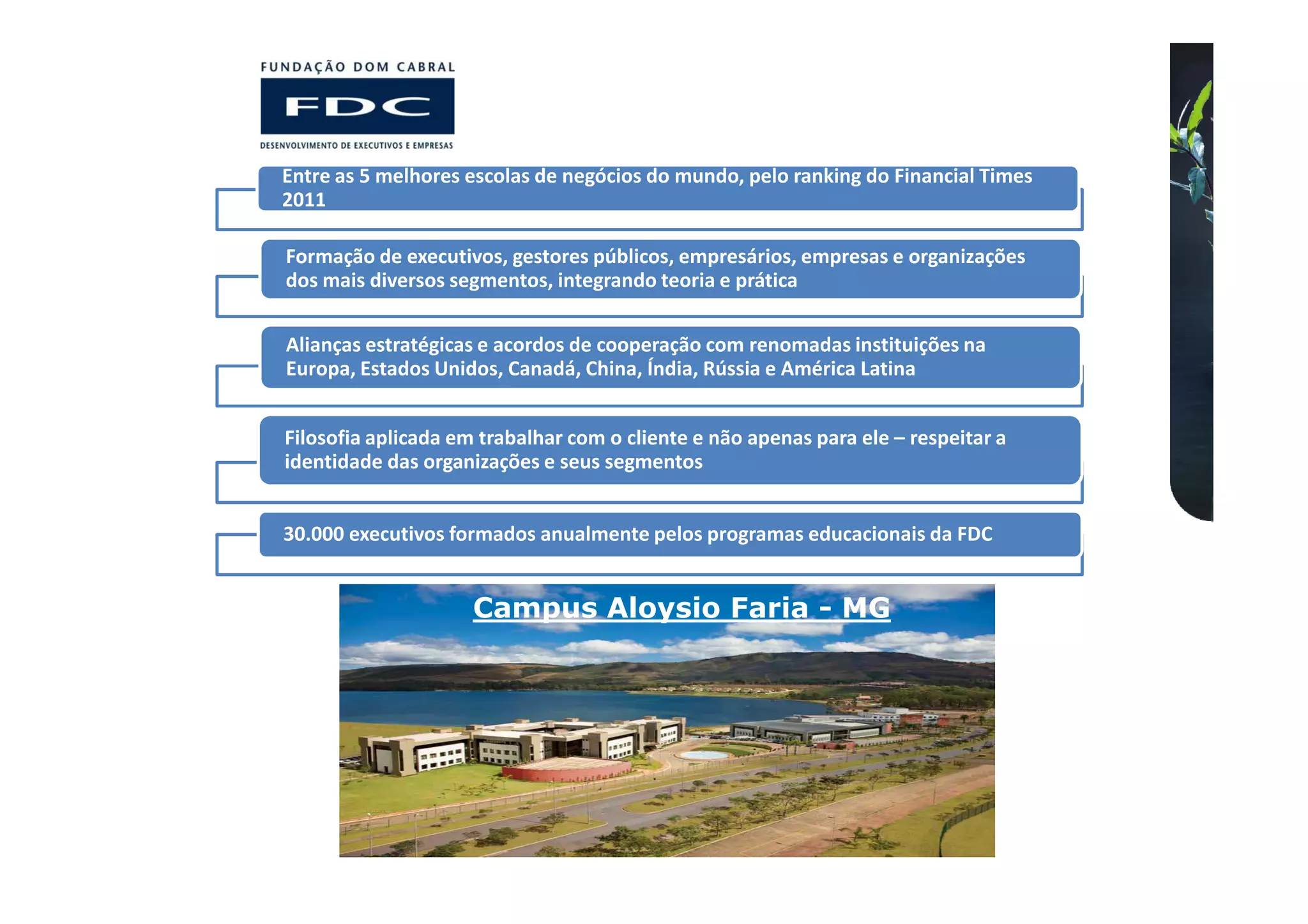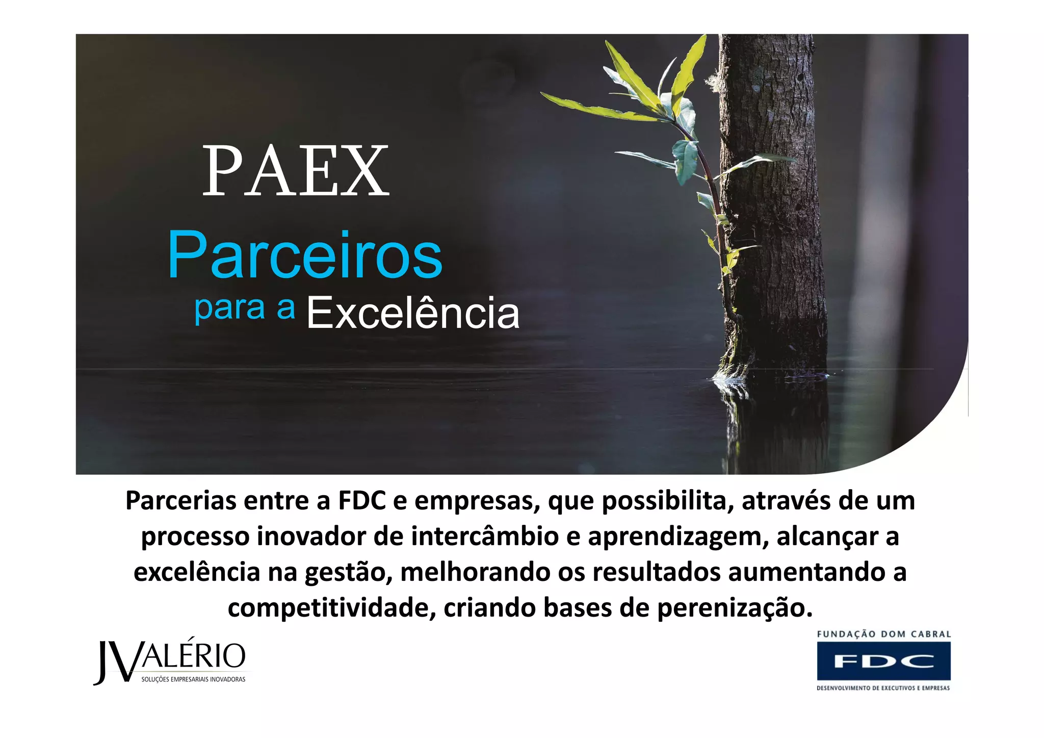 O documento descreve o programa PAEX da FDC, que estabelece parcerias entre a escola de negócios e empresas para promover a excelência gerencial através do compartilhamento de experiências, monitorias especializadas, treinamentos e projetos empresariais com metas de longo prazo. O programa envolve mais de 370 empresas e busca melhorar resultados, competitividade e sustentabilidade por meio de aprendizado mútuo e indicadores de desempenho.
