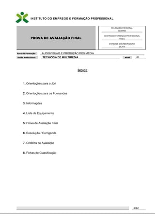 Este documento descreve uma prova de avaliação final para o curso de Técnico/a de Multimédia Nível IV. A prova é composta por 4 partes e avalia os conhecimentos e capacidades adquiridos pelos formandos ao longo da formação. Inclui instruções para os formandos e jurados, lista de equipamento necessário, e as 4 partes da prova cobrindo diferentes áreas como imagem, som, programação e conhecimentos gerais.