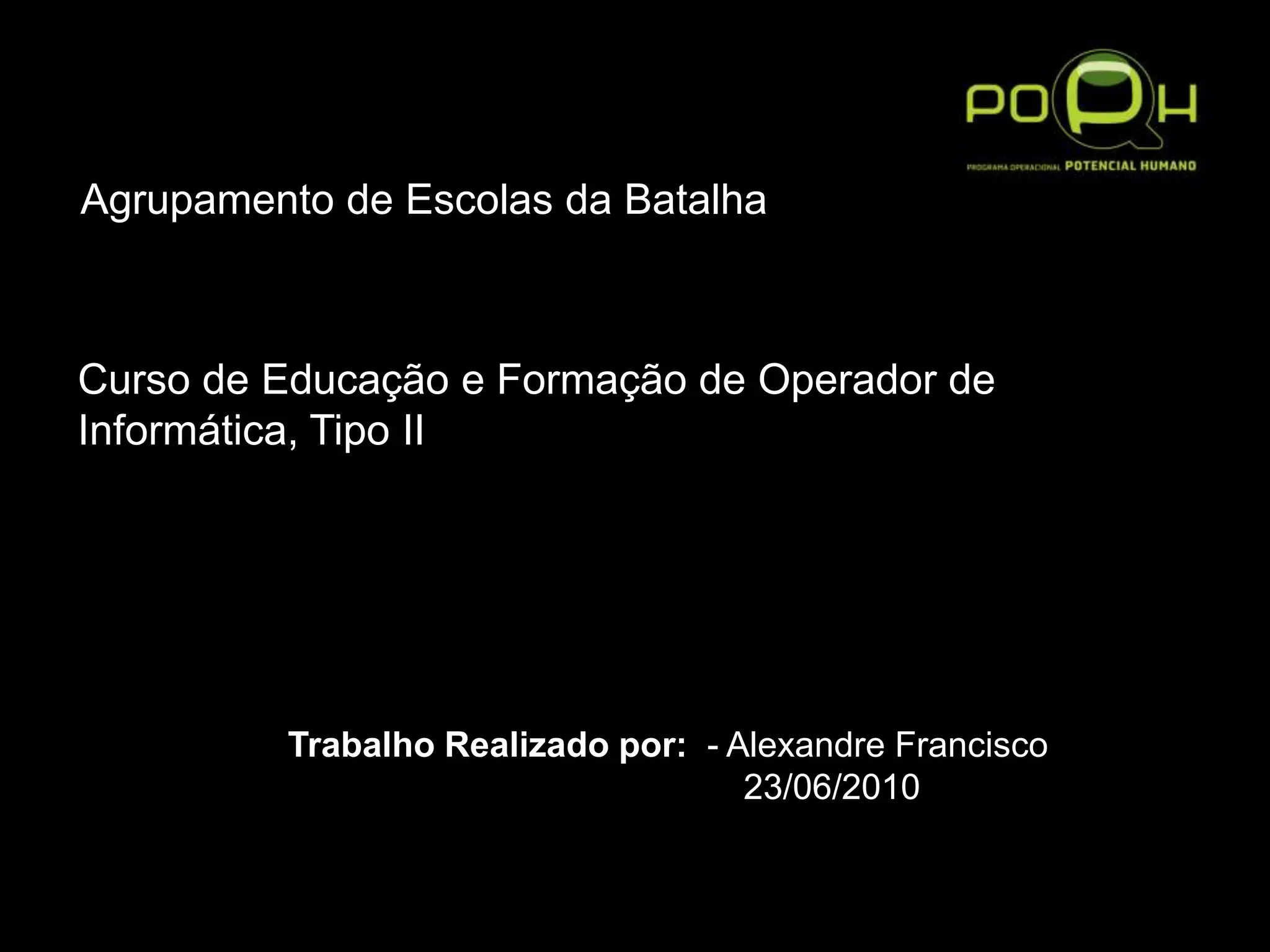 O documento resume as provas realizadas em 19 e 20 de junho sobre disciplinas de um curso de operador de informática, incluindo redes de computadores, aplicações de escritório, sistemas de gestão de base de dados e instalação de computadores. Também fornece os passos para montar um PC e as regras de segurança para tal.