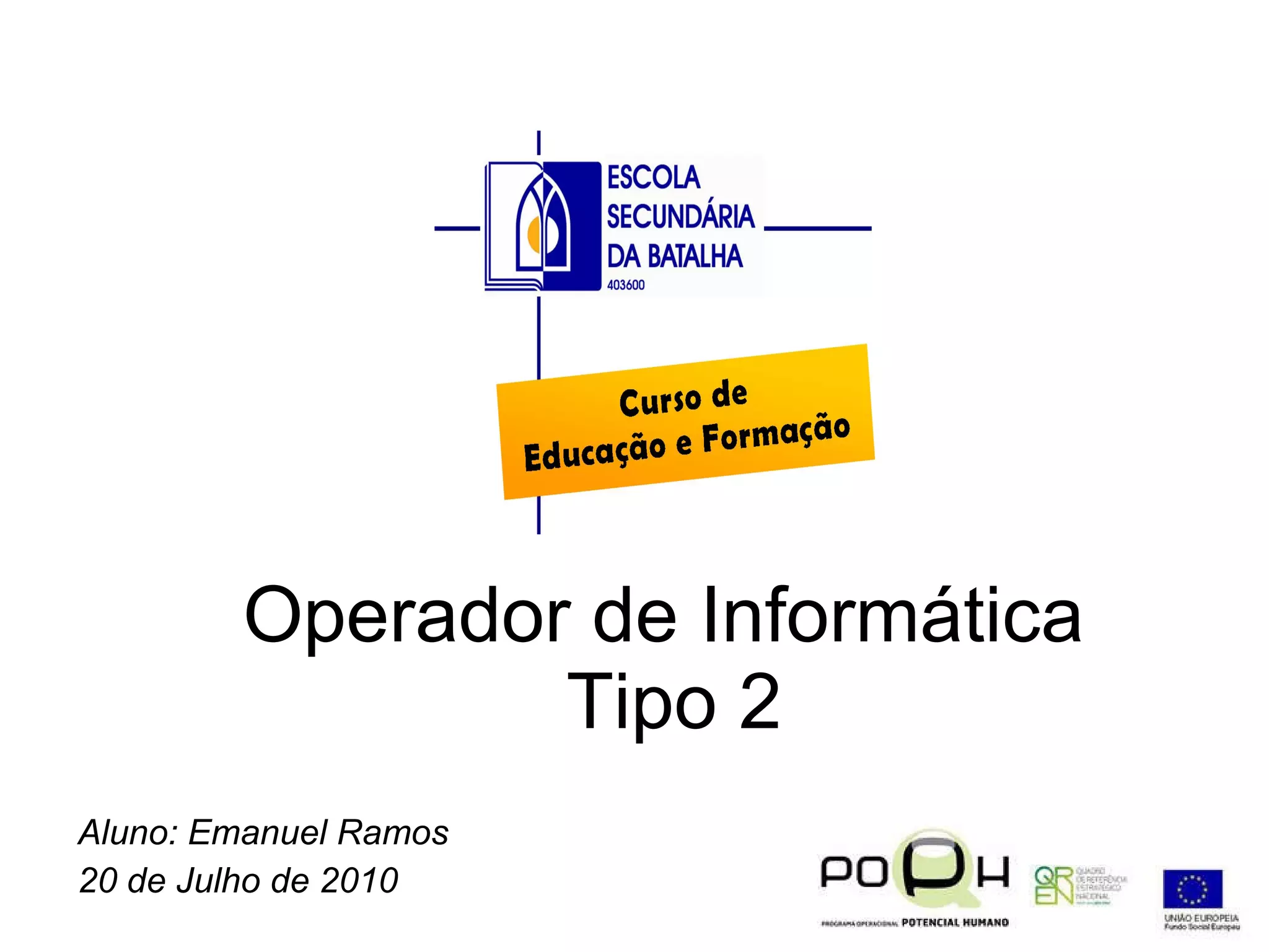 Este documento descreve um curso de formação de Operador de Informática Nível 2. O curso destina-se a jovens entre 15-18 anos e prepara-os para a vida ativa certificando-os com um nível 2 de qualificação profissional. O plano de estudos inclui 210 horas de estágio em contexto de trabalho, que vale 70% da nota final, enquanto a prova final vale os restantes 30%.