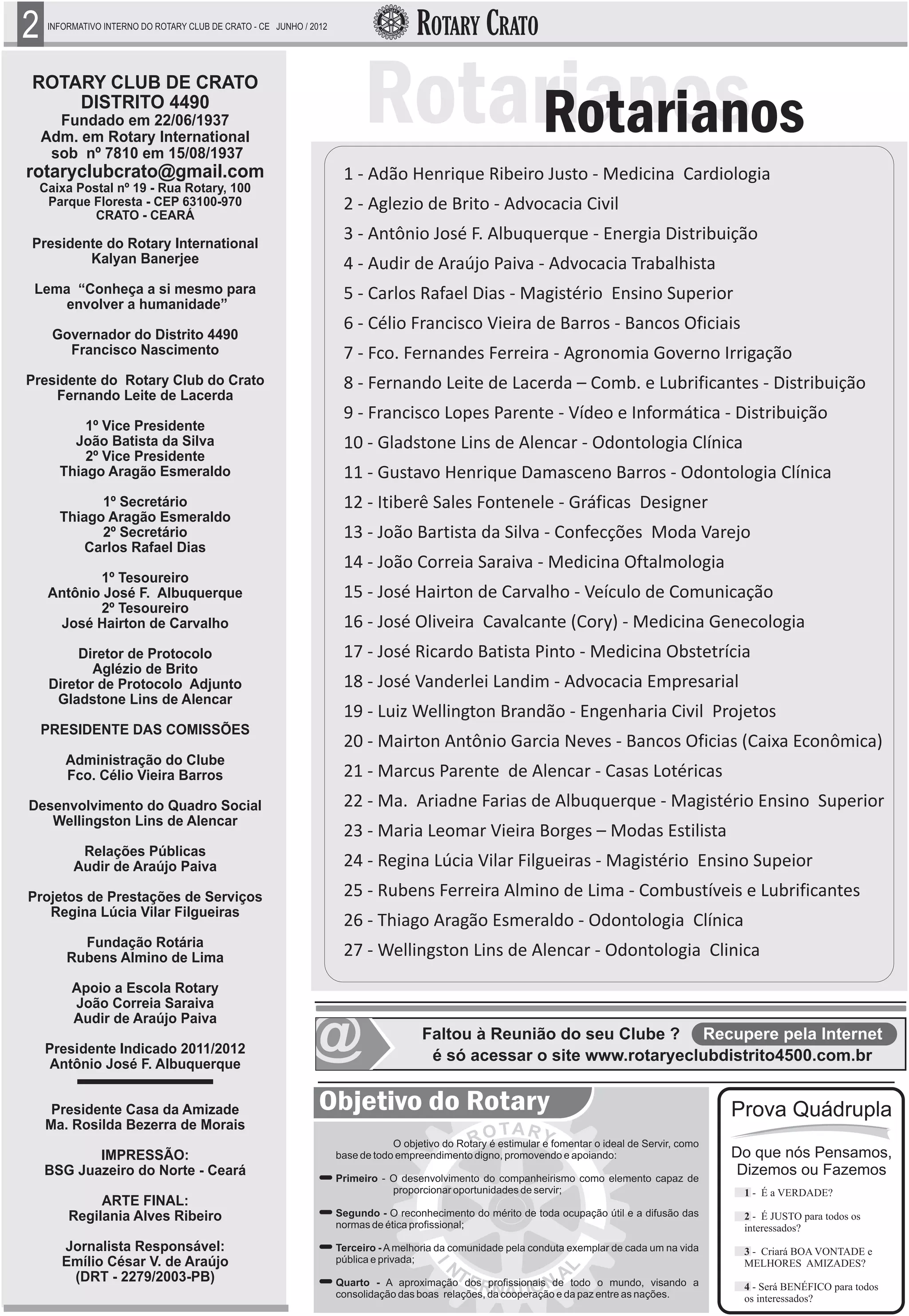 Este documento fornece informações sobre o Rotary Club de Crato no Ceará, Brasil. Ele lista o presidente atual, governador do distrito, e os principais cargos do clube, incluindo 1o e 2o vice-presidentes, secretários e tesoureiros. Também menciona as comissões do clube e o presidente indicado para o próximo ano.