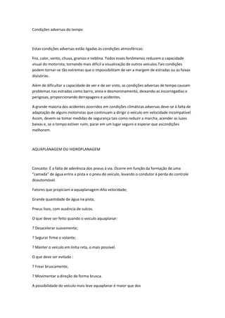 O documento discute vários fatores que podem contribuir para acidentes de trânsito e medidas para preveni-los, incluindo a importância de conhecimento das leis de trânsito, atenção às condições do condutor e da via, previsão de situações de risco, tomada de decisões seguras e habilidade na direção. Fatores adversos como condições climáticas ruins e aquaplanagem também são abordados.