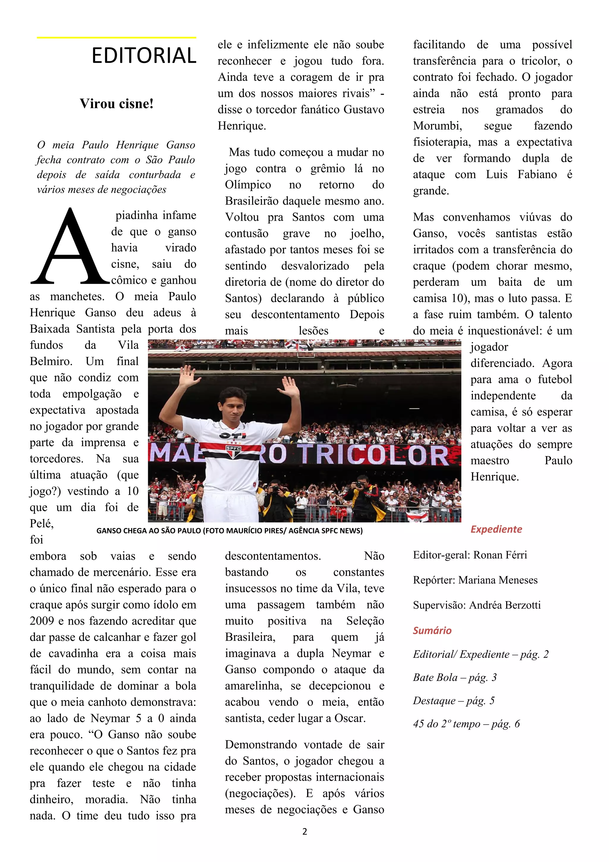 O meia Paulo Henrique Ganso assinou contrato com o São Paulo após uma saída conturbada do Santos, onde era ídolo. Sua transferência para o maior rival causou revolta em torcedores santistas, que o acusaram de ingratidão. Ganso sofreu várias lesões no Santos e sua performance na Seleção Brasileira decepcionou. Após meses de negociação, ele fechou com o São Paulo, onde espera formar dupla de ataque com Luis Fabiano.
