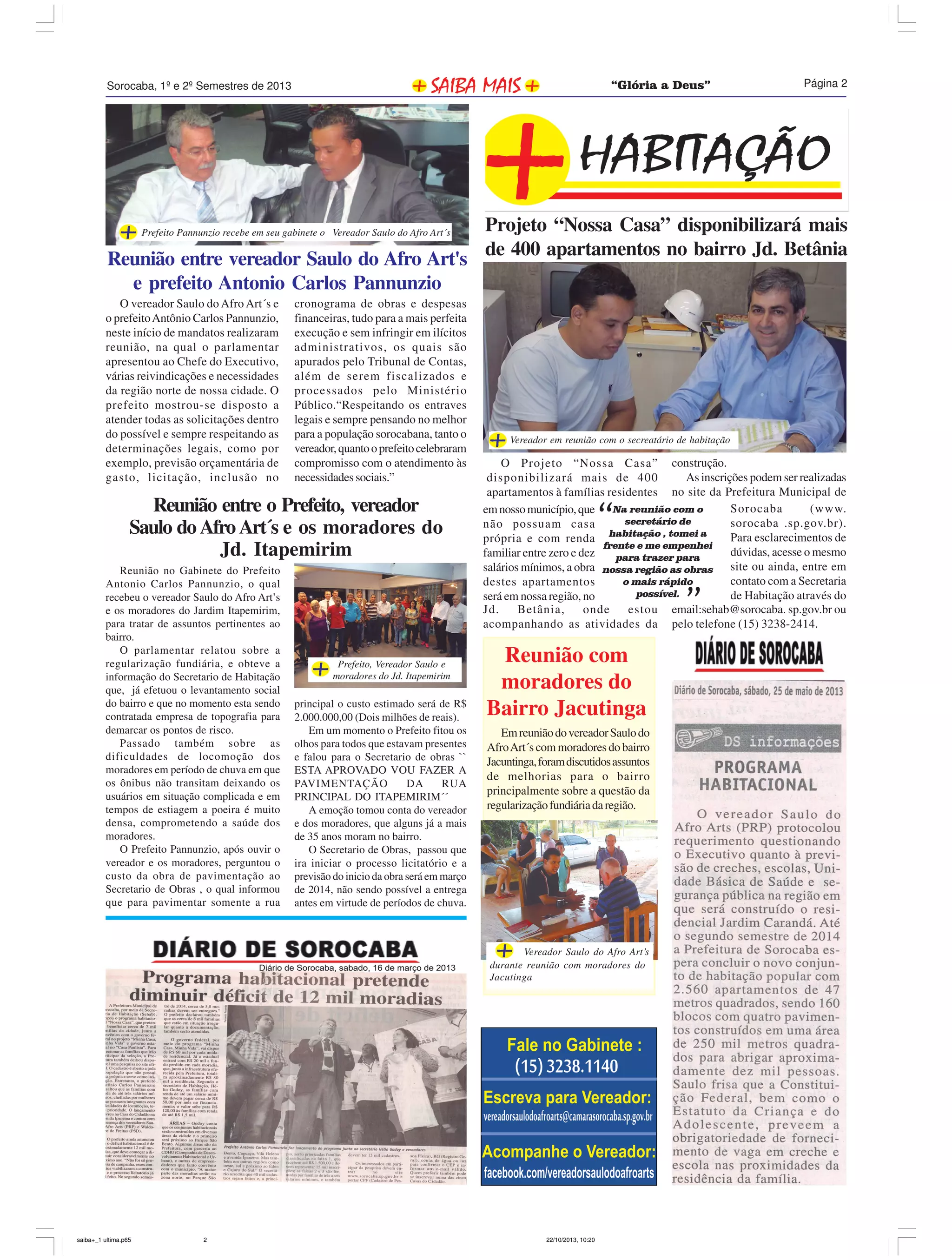 O documento relata três reuniões: 1) entre o vereador Saulo do Afro Art's e o prefeito para discutir necessidades da região norte; 2) entre o prefeito, o vereador e moradores de Jd. Itapemirim sobre regularização fundiária e pavimentação; 3) entre o vereador e moradores de Jacutinga sobre regularização fundiária.