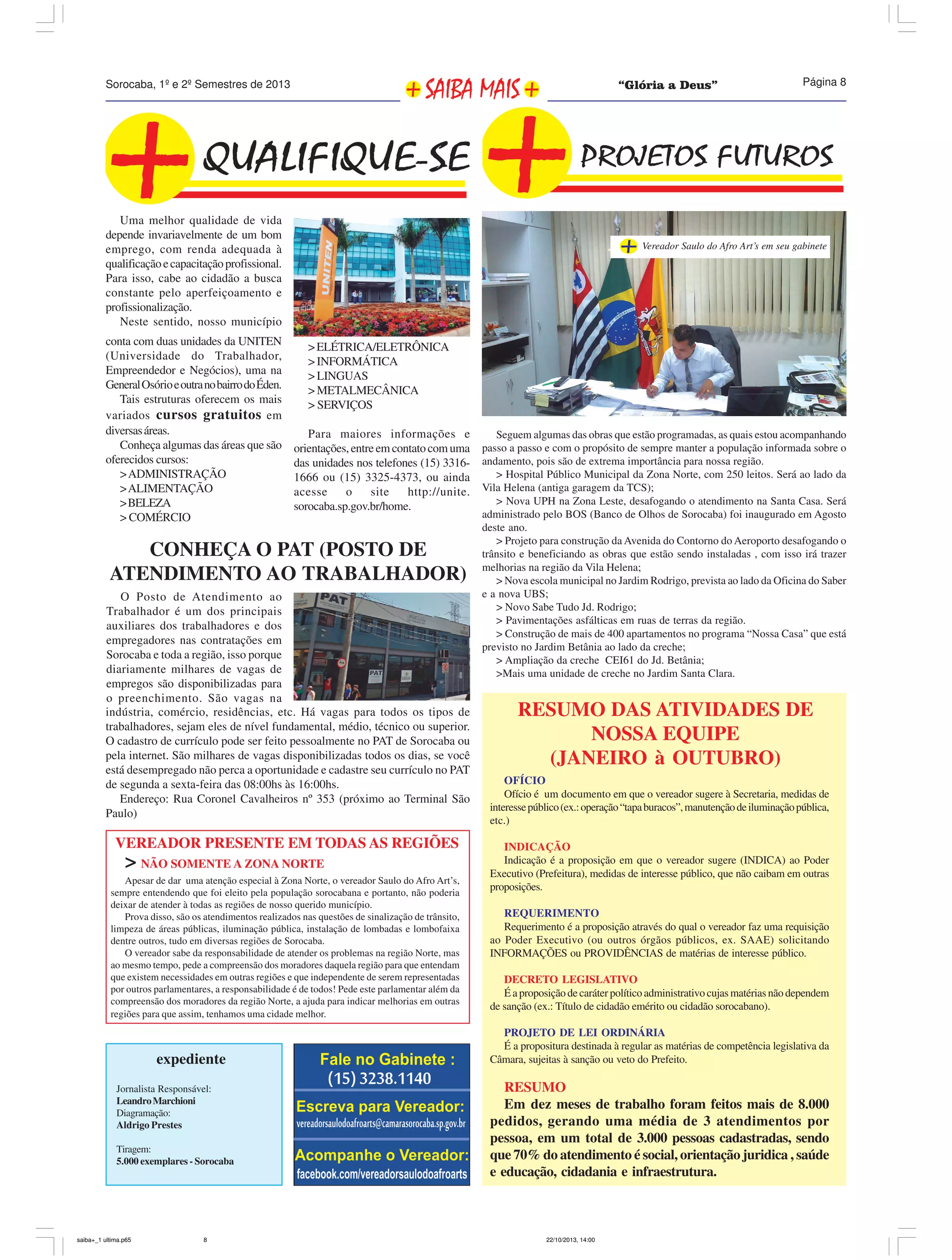 O documento fornece informações sobre cursos gratuitos oferecidos pela UNITEN em Sorocaba em diversas áreas como administração, alimentação e beleza. Também menciona o PAT que disponibiliza vagas de emprego diariamente e as atividades do vereador Saulo do Afro Art's que incluem mais de 8.000 pedidos em 10 meses atendendo cerca de 3.000 pessoas.
