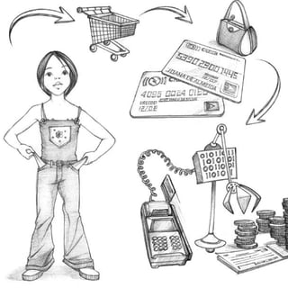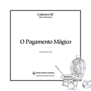 O documento descreve como as crianças descobrem que o cartão de débito da mãe não é mágico, mas sim um meio de pagamento vinculado à conta bancária. A irmã mais velha fica curiosa depois que o irmão mais novo insiste que a mãe é uma bruxa por conseguir compras sem dinheiro. Quando vão às compras, a irmã vê a mãe usar o cartão e percebe que ele desconta o valor da conta bancária, não sendo mágico. O pai explica os tipos de cartão