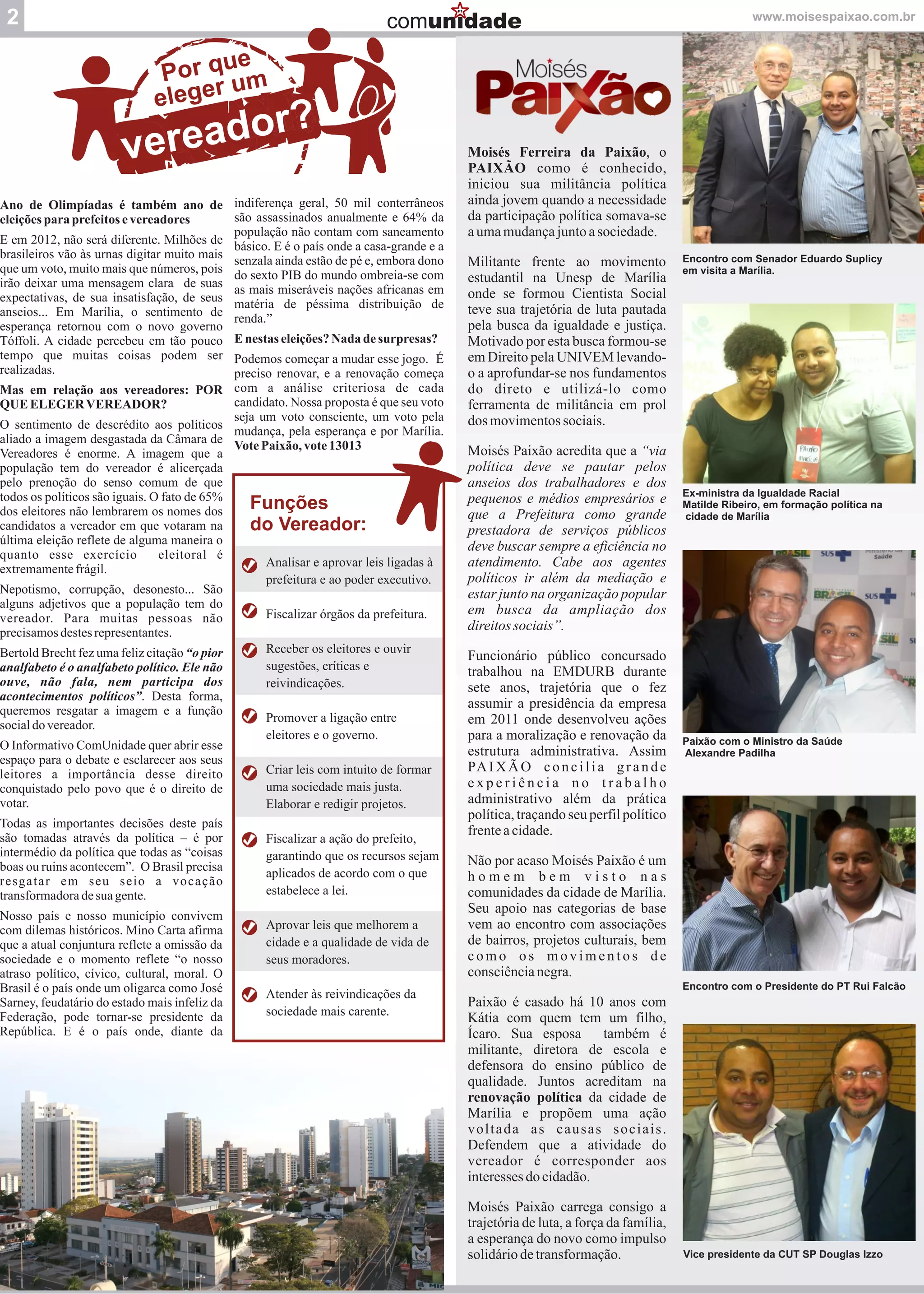 2) Apresenta o perfil do candidato a vereador Moisés Paixão, sua trajetória política defendendo movimentos sociais e sua experiência no serviço público municipal.