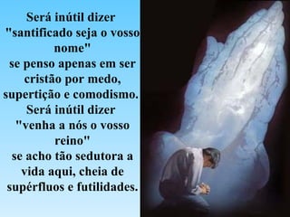 Este documento discute como recitar o Pai Nosso sem viver de acordo com os seus ensinamentos é inútil. Ele argumenta que dizer "Pai Nosso" é vazio se não agirmos como filhos de Deus, valorizarmos os bens celestiais em vez dos terrenos, e seguirmos o caminho de Deus ao invés do mais fácil.