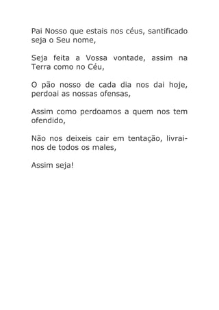Este resumo em 3 frases do Pai Nosso: O Pai Nosso é uma oração cristã que pede a Deus que seu nome seja santificado, que sua vontade seja feita na Terra como no Céu, e que nos dê o pão de cada dia e nos perdoe nossas ofensas assim como perdoamos aos outros.