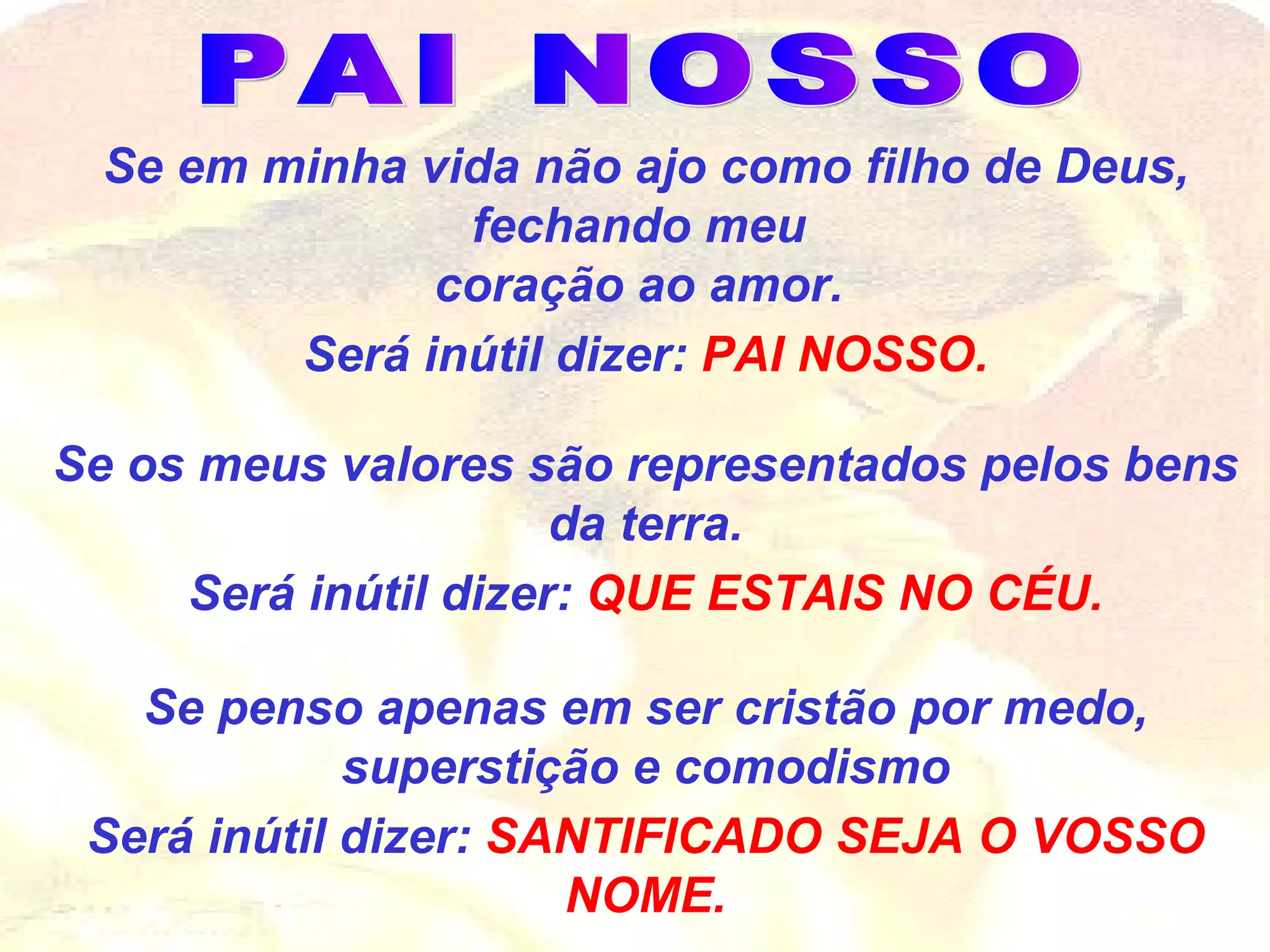 O documento discute como recitar o Pai Nosso sem viver de acordo com os seus ensinamentos é inútil. Ele lista vários comportamentos que contradizem os valores cristãos, como valorizar bens materiais em vez de Deus, não ajudar os necessitados, magoar os outros, e procurar prazeres proibidos. Conclui que continuar sem se modificar apesar de saber disso torna inútil recitar o Pai Nosso.