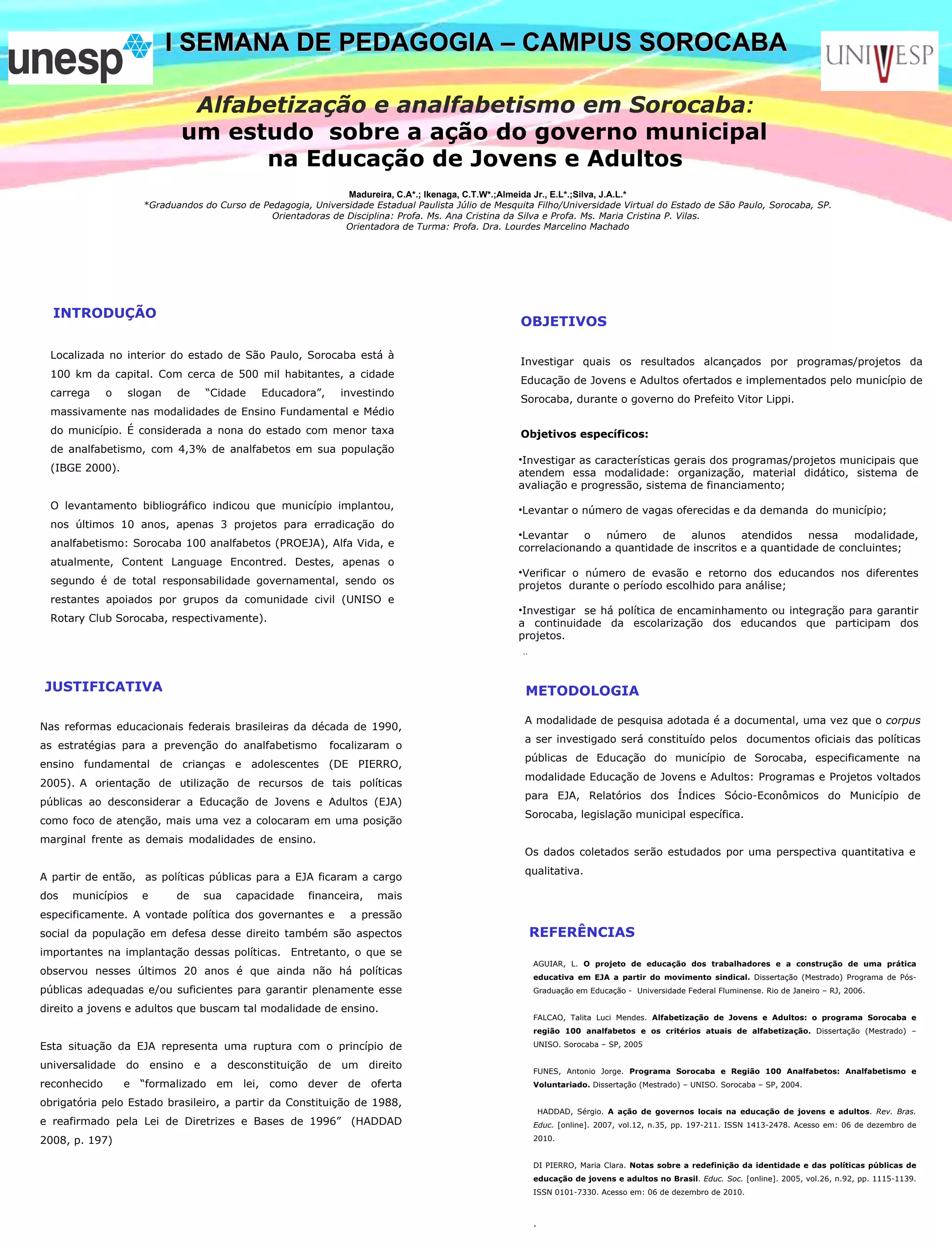 O documento descreve uma pesquisa sobre os programas e projetos de alfabetização e Educação de Jovens e Adultos implementados pelo município de Sorocaba nos últimos 10 anos. O objetivo é investigar os resultados alcançados por esses programas, como o número de vagas oferecidas, alunos atendidos, evasão escolar e continuidade da escolarização. A pesquisa será realizada por meio de documentos oficiais sobre as políticas educacionais do município de Sorocaba.