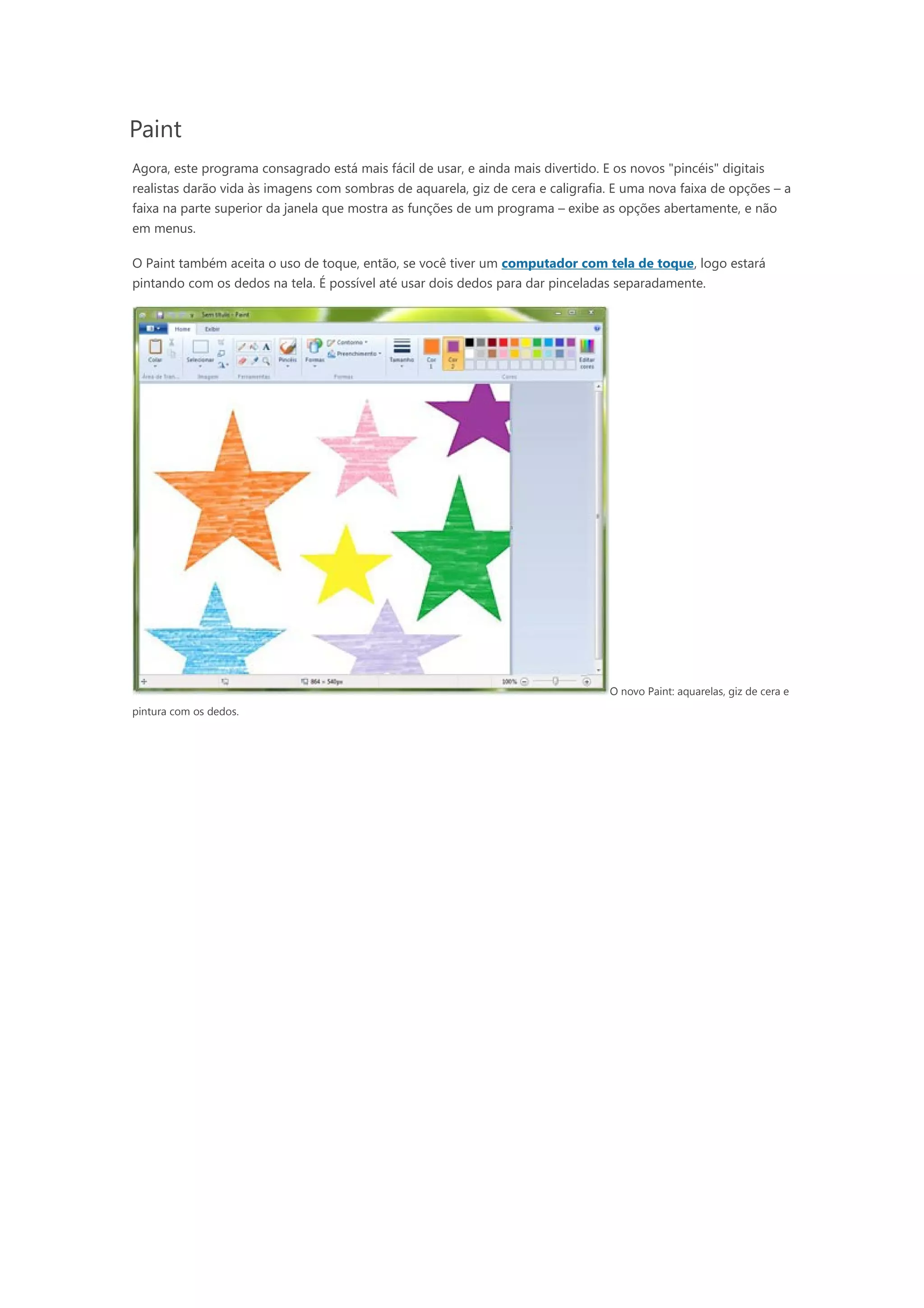 O documento descreve as novas funcionalidades do programa Paint, incluindo pincéis digitais realistas que dão vida às imagens com sombras de aquarela e giz de cera, uma nova faixa de opções que exibe as funções abertamente e suporte para pintura com toque em telas sensíveis ao toque, permitindo usar dois dedos separadamente.