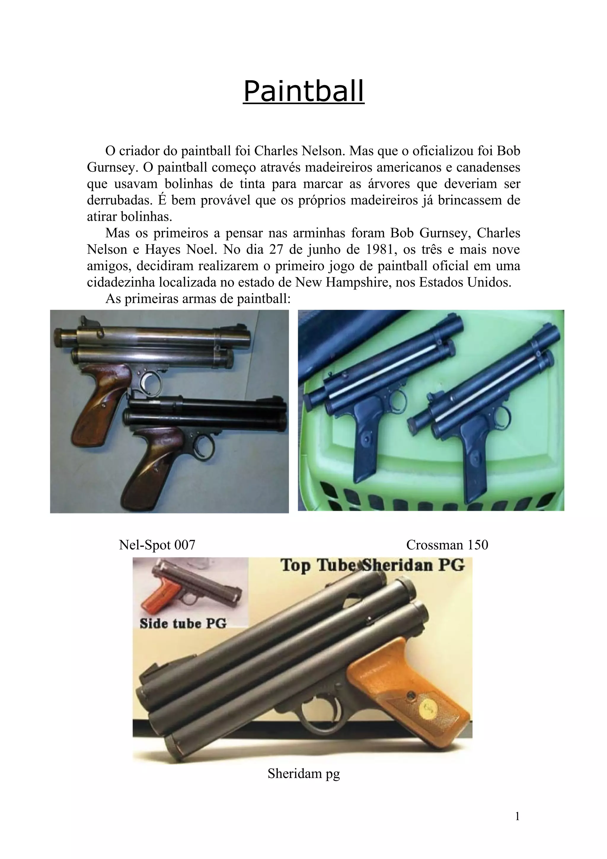 Charles Nelson criou o paintball, mas Bob Gurnsey o oficializou em 1981 durante o primeiro jogo com amigos em New Hampshire. As armas evoluíram de modelos simples como o Nel-Spot 007 para designs mais avançados como o BT-4 Combat. Os equipamentos necessários incluem capacete, arma, CO2 e bolinhas de tinta.