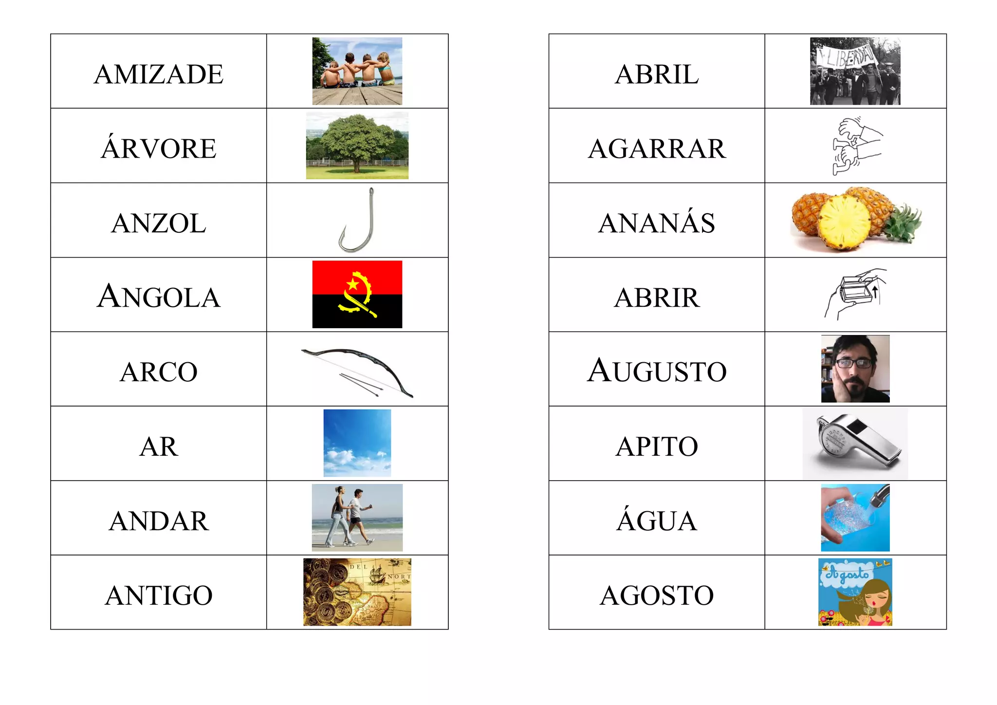 Uma lista de palavras começando com letras do alfabeto em ordem aleatória, incluindo nomes de objetos, animais e conceitos variados como amizade, árvore, anzol, avião, abraçar e outros.