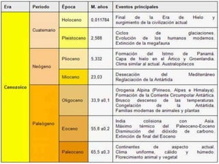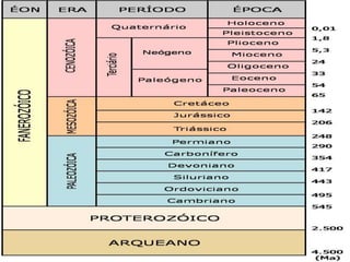 O documento descreve a escala de tempo geológico, focando na Era Cenozóica que começou há 65 milhões de anos. A Era Cenozóica é dividida nos Períodos Terciário e Quaternário, sendo que o Terciário foi marcado pela separação dos continentes e a proliferação de pequenos mamíferos, enquanto o Quaternário viu o surgimento do homem no Pleistoceno e grandes mudanças na flora e fauna.