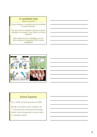 O documento discute a relação entre a sociedade contemporânea e a educação superior, abordando a importância do PPP (Projeto Político-Pedagógico) na formação de graduandos. Destaca-se a função social da universidade, que deve preparar profissionais críticos e engajados com as demandas sociais. Além disso, enfatiza a necessidade de inovação na prática pedagógica e a articulação entre teoria e prática no ensino superior.