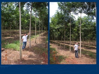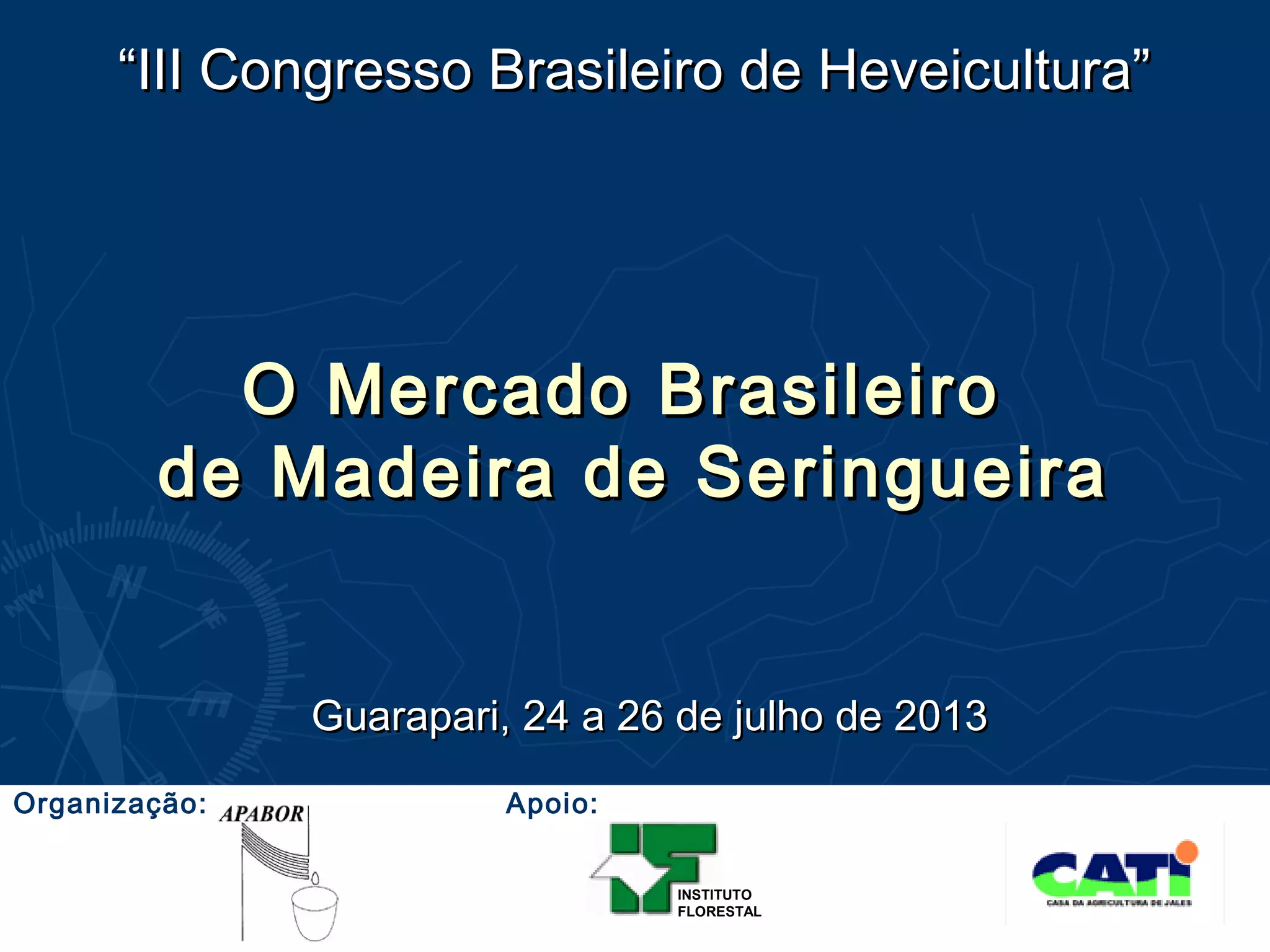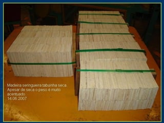 O documento discute o mercado brasileiro de madeira de seringueira. Apresenta bases para avaliar a disponibilidade da madeira, incluindo projetos de pesquisa. Detalha características, exploração e usos da madeira de seringueira, argumentando que a cultura pode ser uma "floresta de uso múltiplo".