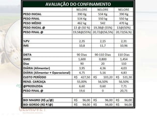 O documento fornece orientações sobre como maximizar a eficiência do confinamento de gado através da gestão estratégica, planejamento, análise de mercado e gestão de riscos. Ele discute objetivos como desempenho, conversão alimentar e rendimento de carcaça, e enfatiza a importância da tomada de decisões, planejamento, organização e controle de custos. Finalmente, analisa diversos fatores que influenciam o processo de engorda e a qualidade da mistura de ração.