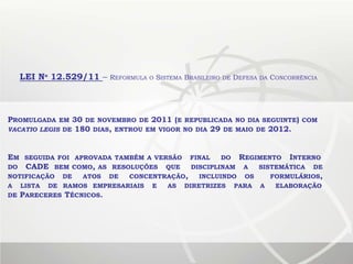 A nova Lei de Defesa da Concorrência (Lei 12.529/11) reformulou o sistema brasileiro, introduzindo um tribunal administrativo no CADE com mandatos fixos, um sistema de análise prévia de atos de concentração e novas regras para notificação, análise e penalidades. A lei também estabeleceu prazos máximos para análise, novas definições de atos concentrativos e regras para confidencialidade.