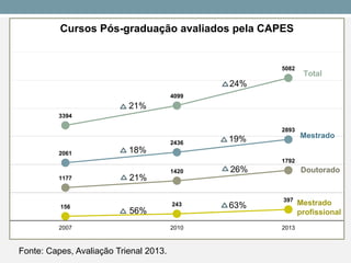 O documento discute a pós-graduação, produção e socialização do conhecimento científico no Brasil. Apresenta estatísticas sobre o crescimento dos programas de pós-graduação, qualificação, produção científica e técnica entre 2007-2013. Também aborda políticas de incentivo à inovação como o Plano Inova Empresa e a Estratégia Nacional de Ciência, Tecnologia e Inovação, visando aumentar investimentos em pesquisa, desenvolvimento e inovação.