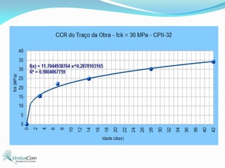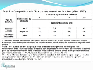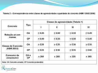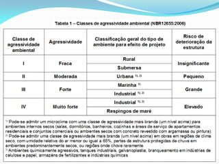 O documento discute os conceitos e a importância do controle da qualidade do concreto para garantir a durabilidade das estruturas ao longo do tempo. Também aborda as mudanças nas normas para exigir concretos menos porosos e mais resistentes aos agentes agressivos do meio ambiente. Destaca a importância da resistência mecânica do concreto ser controlada e atender aos valores projetados para assegurar a segurança das construções.