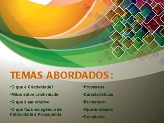 O documento discute os conceitos de criatividade e o trabalho de uma agência de publicidade. Apresenta os principais departamentos de uma agência, incluindo atendimento, planejamento, mídia, produção, criação e processos como brainstorming. Também aborda oportunidades na publicidade online e offline.