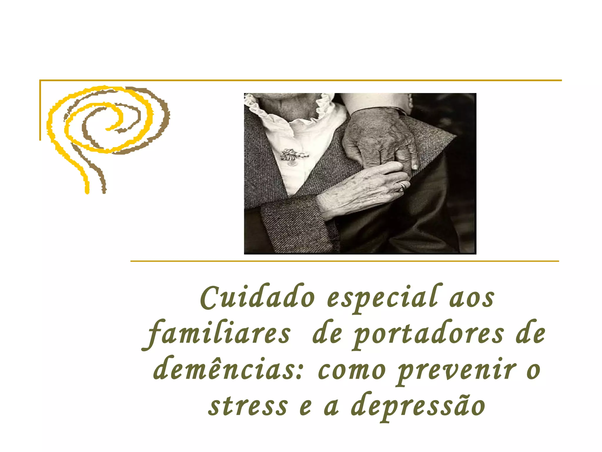 O documento discute os desafios enfrentados por cuidadores de pessoas com demência e formas de prevenir o estresse e a depressão. Ele fornece informações sobre demência e seu impacto, características comuns de cuidadores, sinais de estresse e depressão, estratégias para promover a resiliência e cuidar da saúde do cuidador.