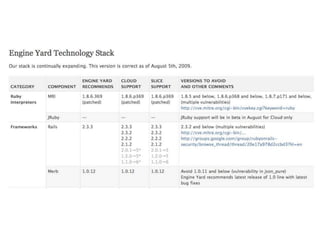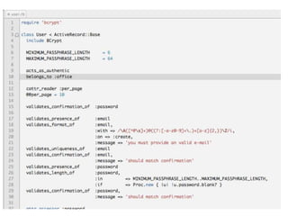 O documento discute tópicos importantes de segurança em aplicações Rails, incluindo: 1) Como sessões funcionam e como mantê-las seguras; 2) Problemas como roubo e reenvio de sessões e como evitá-los; 3) Boas práticas como não armazenar dados críticos em sessões.