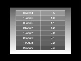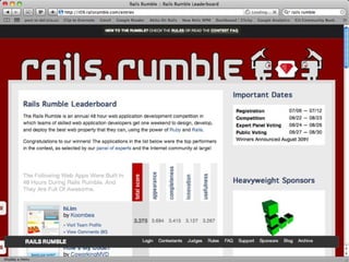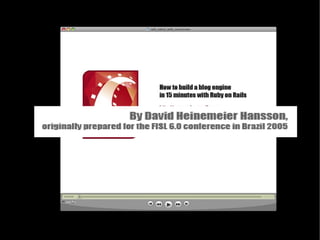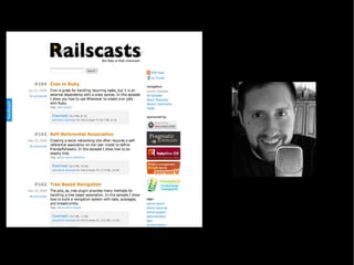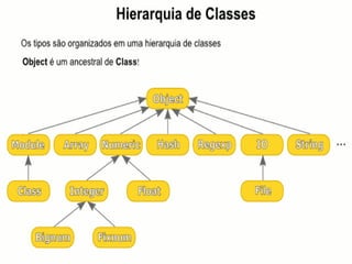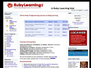 O documento resume as principais características e conceitos da linguagem de programação Ruby e do framework web Ruby on Rails. Foi lançado em 1995 e projetado para tornar os programadores felizes, com sintaxe enxuta e tudo como objeto. Rails facilita o desenvolvimento web ágil com convenções sobre configuração, DRY e simplicidade.