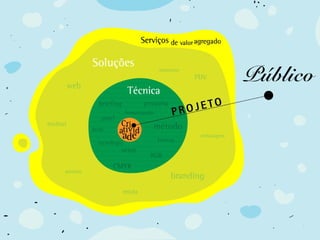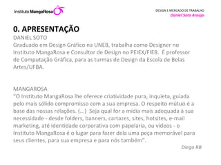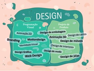 Este documento discute o campo do design e o mercado de trabalho para designers. Primeiramente, define o que é design e o papel do designer. Em seguida, descreve como o design pode atuar dentro de empresas e os tipos de empresas que contratam designers. Por fim, discute como os designers autônomos podem atuar e cobrar por seus serviços.