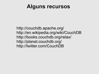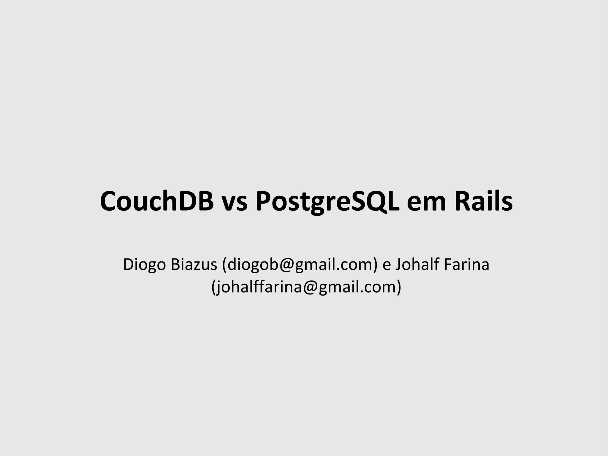 O documento compara CouchDB e PostgreSQL em um contexto de desenvolvimento com Rails, destacando as características e vantagens de ambos os sistemas de gerenciamento de banco de dados. CouchDB é um banco de dados orientado a documentos que permite flexibilidade e versionamento, enquanto PostgreSQL é um SGBD relacional com uma variedade de extensões e funcionalidades avançadas. O desempenho foi testado, mostrando que em algumas operações CouchDB superou PostgreSQL.