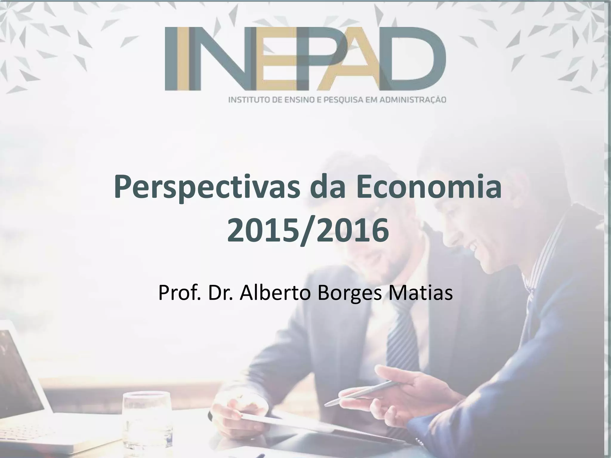 O documento apresenta o currículo do professor Alberto Borges Matias, que irá falar sobre perspectivas da economia brasileira em 2015/2016. A agenda inclui tópicos como a economia internacional, crise do subprime, economias dos EUA, BRICS e brasileira.