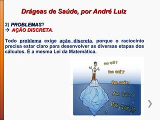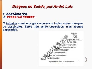 Este documento fornece 20 conselhos/sugestões para problemas comuns da vida, como obstáculos, problemas, provações e cansaço. Cada conselho é apresentado em uma frase curta que propõe uma solução positiva, como trabalhar sempre, ação discreta, aceitar provações, perdoar ofensas, ter paciência, esquecer mágoas, pacificar discórdias e confiar em Deus para lidar com tempestades da vida.