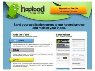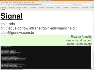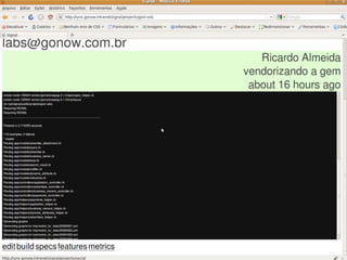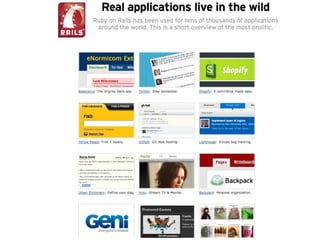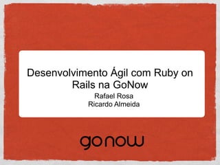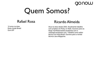 O documento apresenta Ruby on Rails, um framework web para desenvolvimento ágil. Apresenta os palestrantes Rafael Rosa e Ricardo Almeida e discute conceitos como MVC, convenção sobre configuração e testes como RSpec e Cucumber. Explica como Rails promove produtividade e código de qualidade através de ferramentas como versionamento, integração contínua e monitoramento.