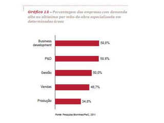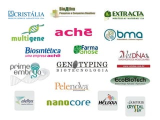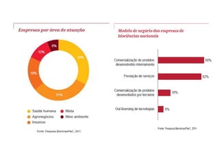 O documento descreve a formação em biotecnologia no Brasil, incluindo 47 cursos de graduação e 36 programas de pós-graduação em 2001. Detalha as áreas estratégicas, prioritárias e de fronteira de pesquisa em biotecnologia, além de mostrar estatísticas sobre grupos de pesquisa, pesquisadores e estudantes na área entre 2000-2010. Aponta a importância da interação entre academia e indústria para propriedade intelectual, transferência de tecnologia e serviços.