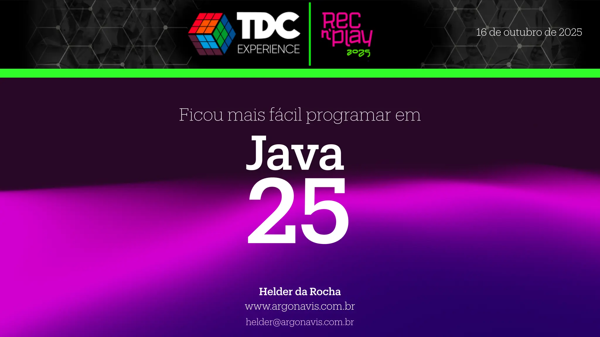 Apresentação realizada no Rec'n'Play 2025 TDC Experience em Recife, 16 de outubro de 2025. Sobre a evolução do Java, projetos do OpenJDK, as versões que as pessoas estão usando, o projeto Amber e Loom, que estão modernizando a linguagem, fazendo ser mais agradável programar em Java, e sobre as novidades de sintaxe desde o último LTS (Java 21).