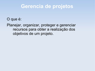 O documento aborda a importância da padronização na gerência de projetos, enfatizando que a ausência de padrões pode levar a falhas nos resultados e à desorganização. Ele descreve os conceitos fundamentais de gerenciamento de projetos, incluindo as fases de iniciação, planejamento, execução, controle e encerramento, assim como as áreas de conhecimento necessárias para gerenciar efetivamente um projeto. Além disso, menciona o papel do gerente de projetos e a necessidade de comunicação eficiente entre as partes interessadas para o sucesso do projeto.