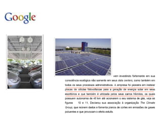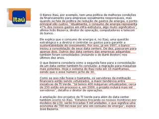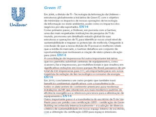 O documento aborda os benefícios tangíveis e estratégicos do Green IT, destacando a importância da sustentabilidade no contexto atual. Apresenta dados sobre o impacto ambiental da tecnologia da informação e casos de empresas que implementaram práticas sustentáveis, resultando em redução de emissões de CO2 e otimização de recursos. Enfatiza que a adoção de políticas ambientalmente responsáveis é essencial para a continuidade e competitividade dos negócios.